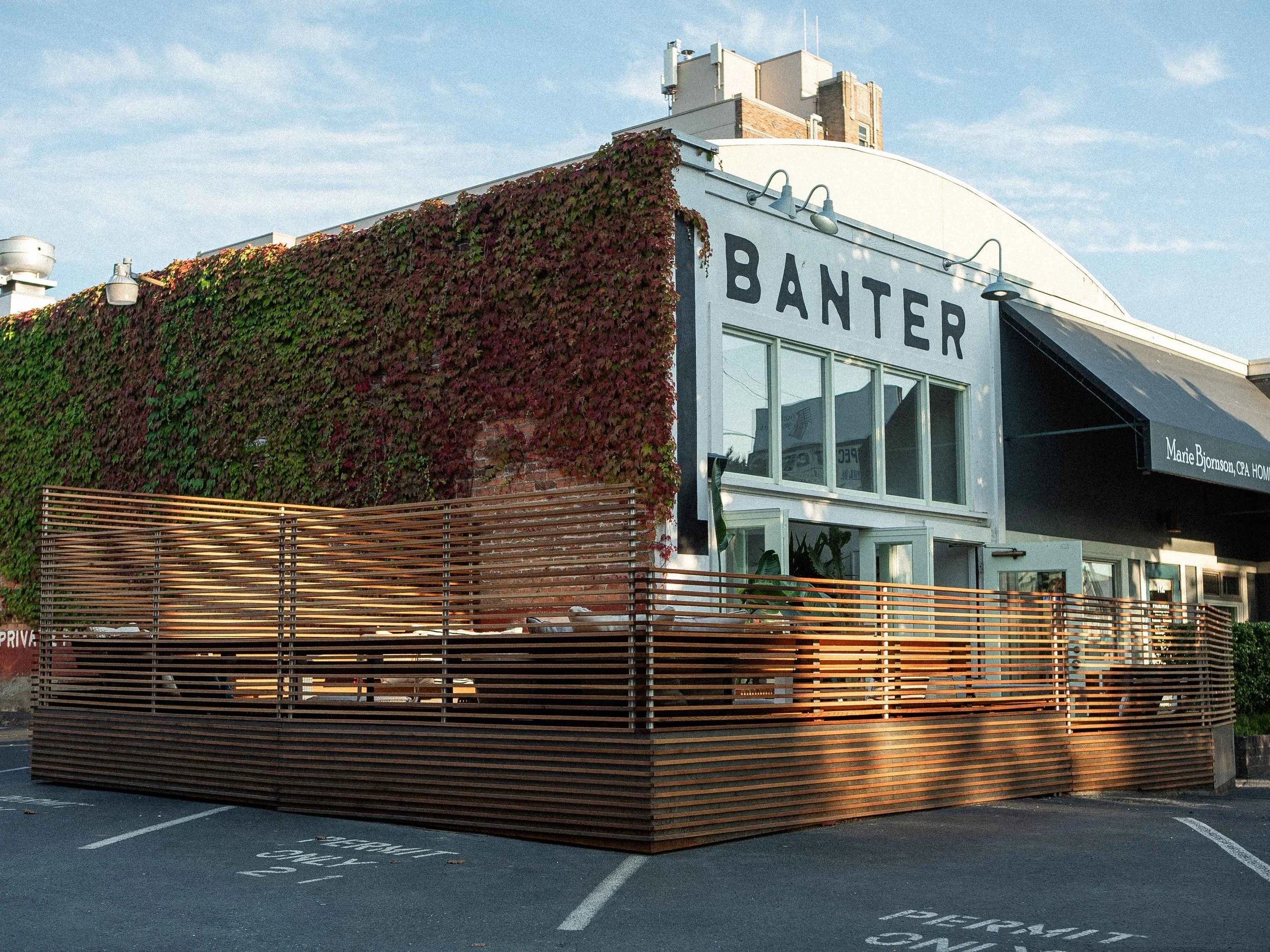 Banter wanted a patio with some personality. Not a standard restaurant enclosure, something that actually felt worth sitting in. The horizontal cedar slats work as a screen more than a barrier. You're outside, you're enclosed, but you can still see out. Connected to the street without being on it. That street just happens to face a parking lot… But it's a good looking parking lot.
