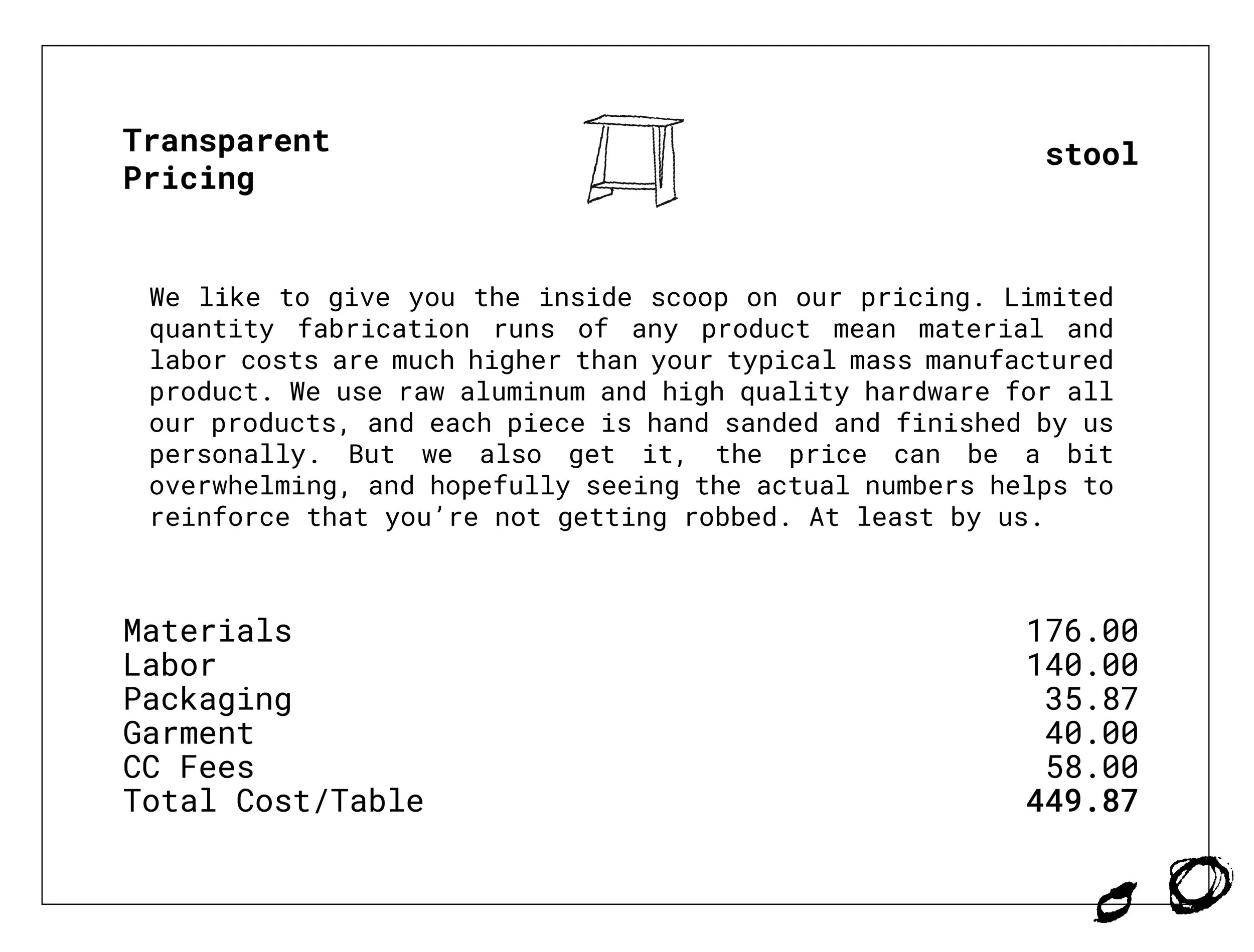 All Nook Studio furniture pieces are handcrafted and often feature unconventional materials, finishes, and forms. Due to the experimental nature of our work, some products may contain edges or surfaces that can feel sharp to the touch. Customers are advised to handle products with care and be cognizant of children or pet’s interaction with them. By purchasing from Nook Studio, you acknowledge that you understand the nature of these products and assume responsibility for their safe use.